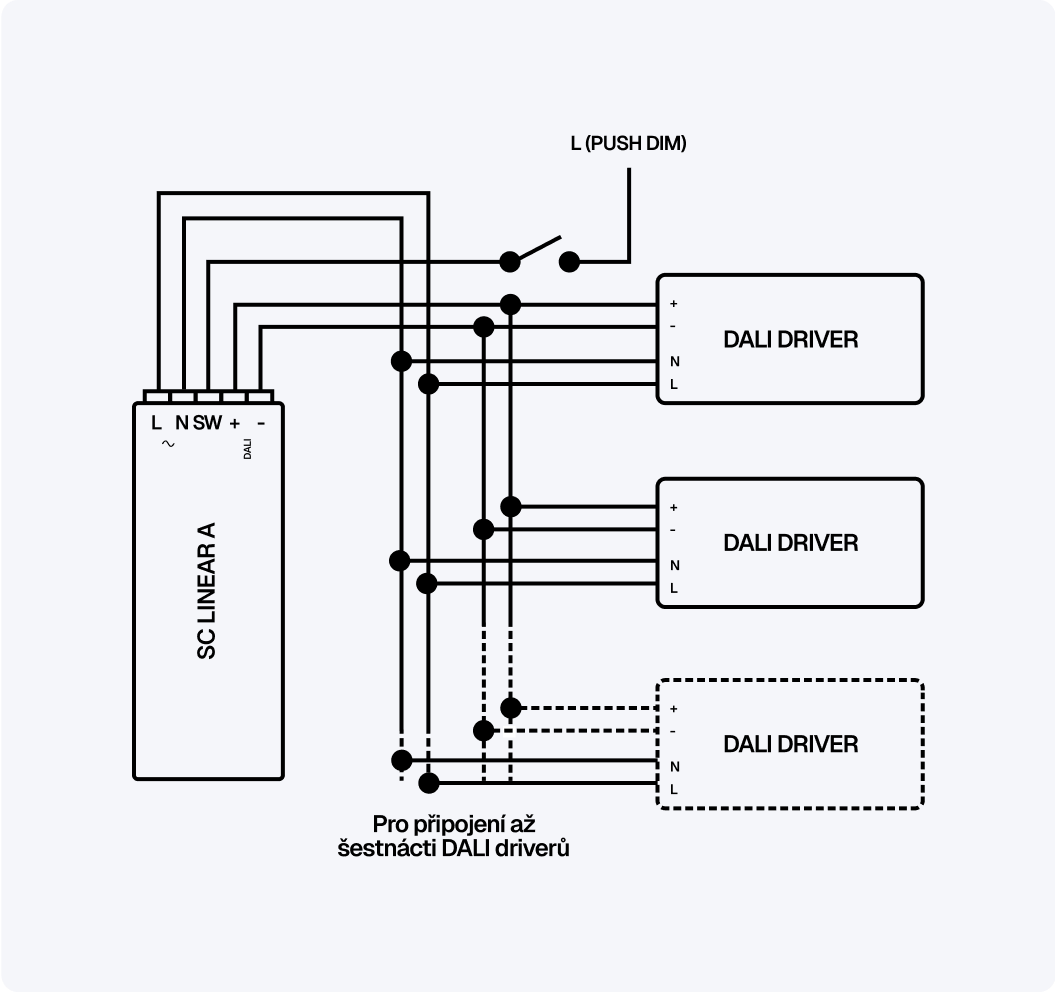 Section titled “Schéma zapojení”Kontroler SC Linear A dokáže po DALI lince řídit až 16 paralelně zapojených DALI driverů.