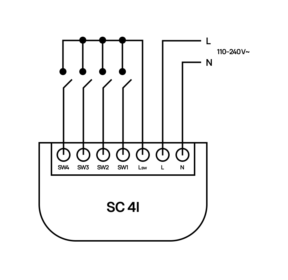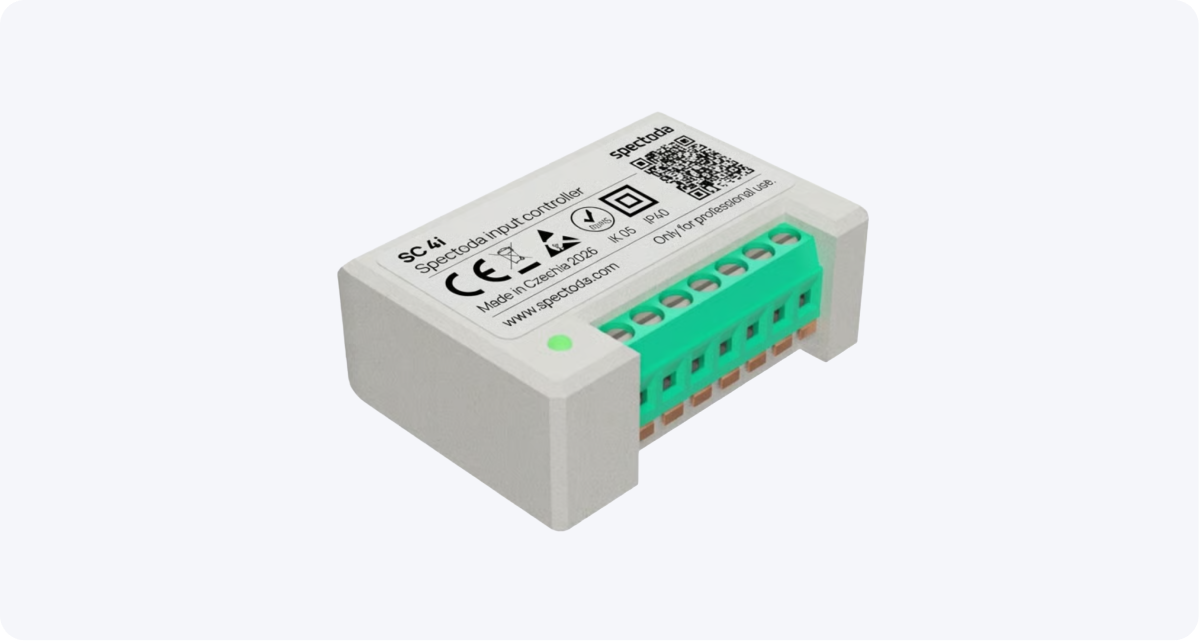 SC 4i A je vstupní kontrolér navržený pro připojení až 4 fyzických tlačítek nebo vypínačů do ekosystému Spectoda.
